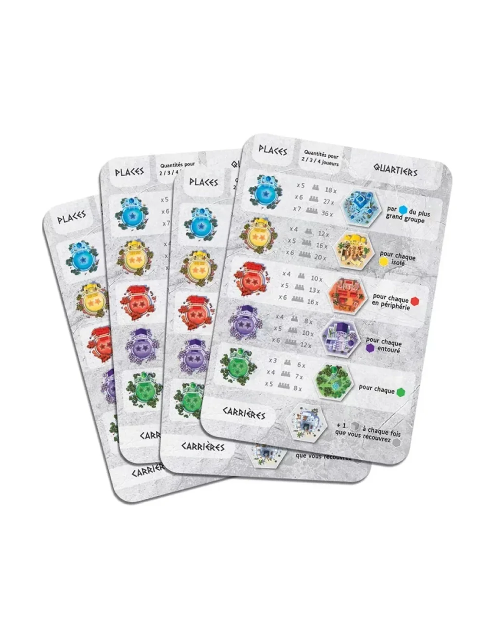 Cada tipo de distrito puntúa de forma distinta: por ejemplo, los cuarteles quieren estar en los bordes, los templos rodeados de otros barrios, los mercados sin repetir colores, etc. Además, necesitarás canteras de piedra para poder construir en niveles superiores, multiplicando el valor de tus barrios. Con reglas sencillas, ofrece un puzzle táctico donde cada loseta cuenta.