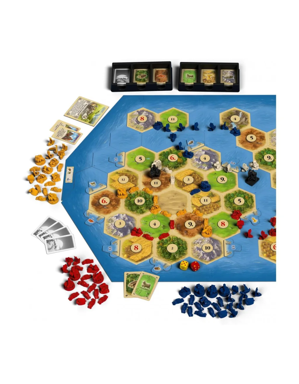 Amplía tu Catan con mares, islas y barcos. Construye puertos, arma rutas marítimas y descubre nuevas islas para conseguir recursos. Incluye escenarios que cambian el mapa y la forma de jugar, manteniendo las reglas sencillas del juego base.