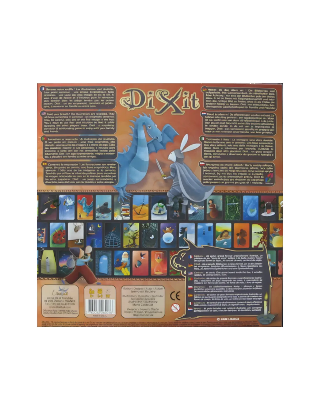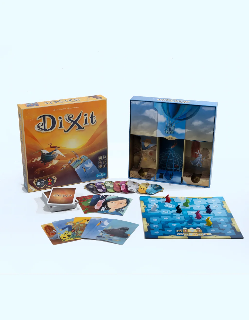 En Dixit, cada jugador se convierte en narrador por turnos, eligiendo una carta ilustrada de su mano y dando una pista en forma de palabra, frase, canción o sonido.