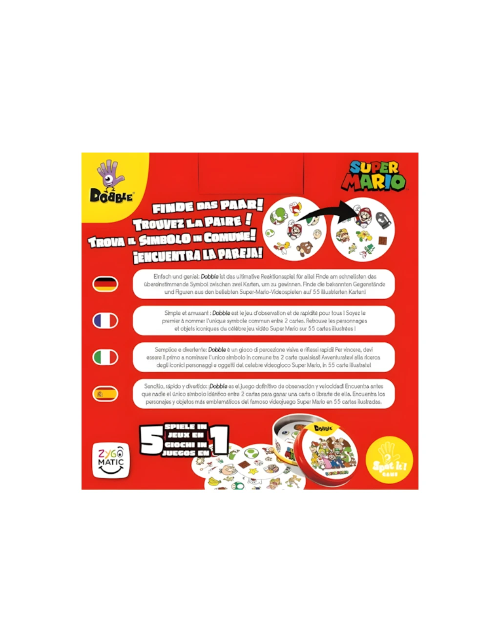 Dobble Super Mario es la versión temática del popular juego de agudeza visual Dobble, ambientada en el colorido universo de Mario, Luigi y sus amigos.