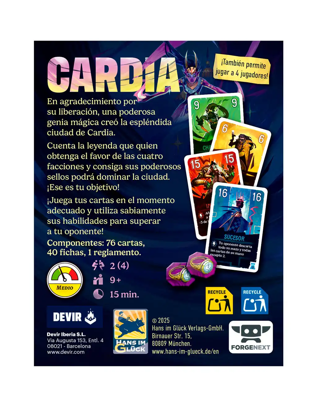 Duelo por Cardia es un juego de cartas estratégico para 2 jugadores (con variante para 4) donde cada decisión cuenta. En la ciudad mágica de Cardia, cuatro facciones –la Rebelión de los pantanos, la Academia, el Gremio y la Dinastía– luchan por el poder. Solo quien consiga más anillos de sello logrará el favor de estas facciones y será proclamado nuevo gobernante.