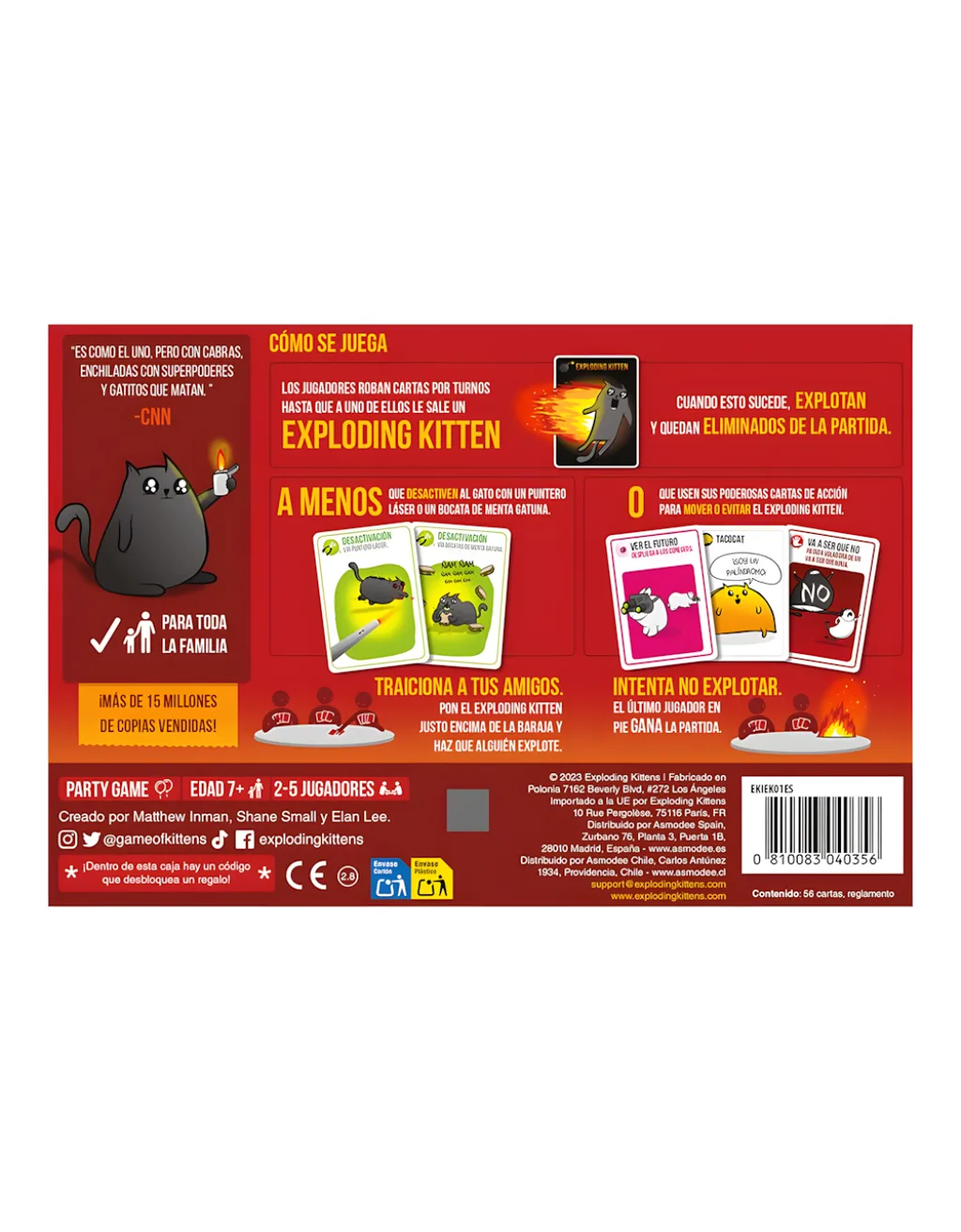 El resto de las cartas permiten alterar el orden del mazo, obligar a otros a robar, saltar turnos o espiar las cartas que vienen, generando momentos de tensión y risas aseguradas.