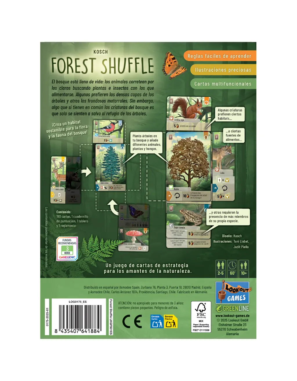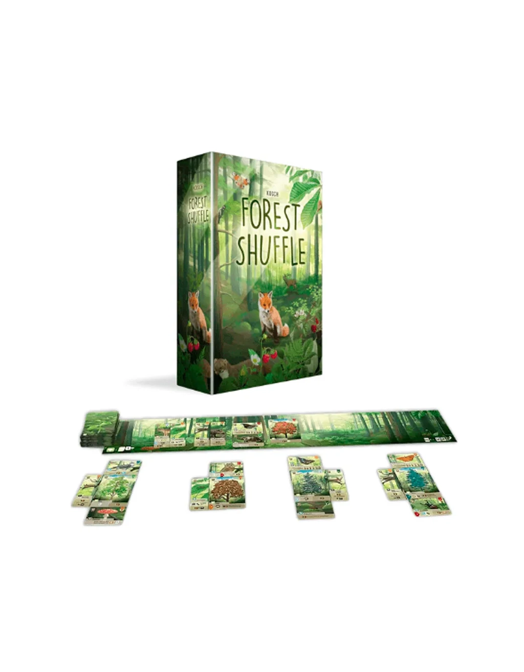 En Forest Shuffle creas tu bosque con cartas de árboles, animales y plantas. Robas cartas del mazo/mercado y pagas el coste descartando otras para jugarlas en tu zona. Muchas cartas puntúan si cumplen condiciones (parejas, hábitats, cercanías), así que la clave es conectar especies para armar combos y sumar más puntos que los demás.
