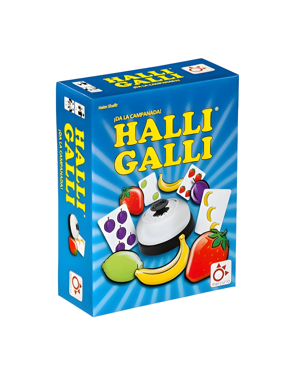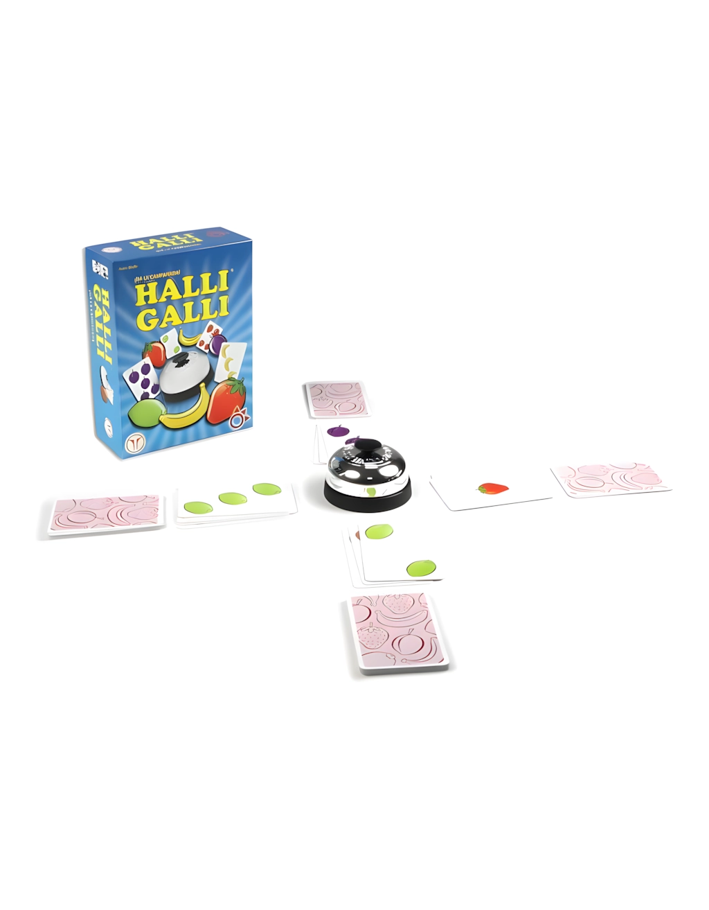 Halli Galli es un juego de rapidez y atención. Hay una campana en el centro y todos van volteando cartas con frutas.