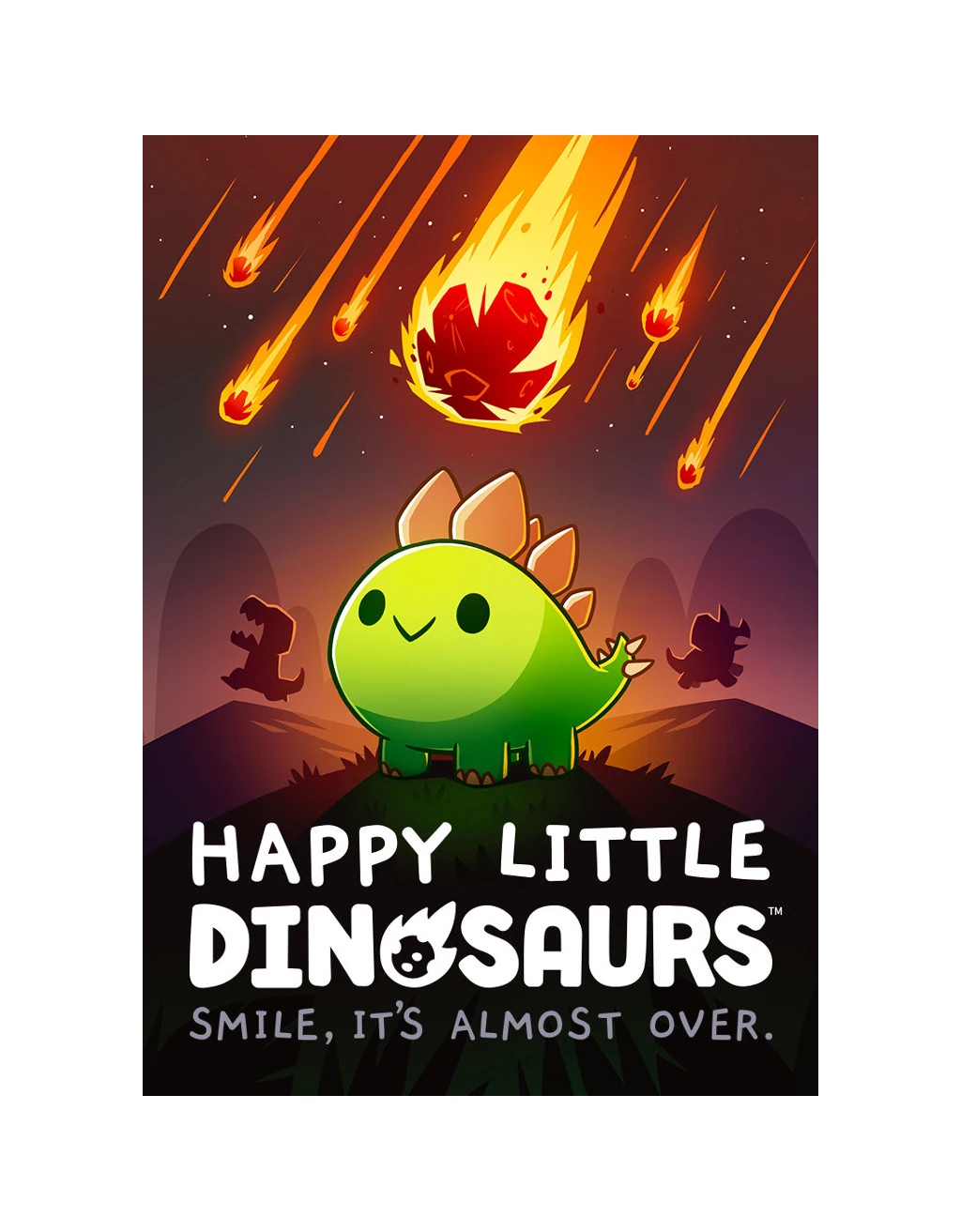 En Happy Little Dinosaurs cada jugador lleva a su dinosaurio y trata de evitar desastres (meteoritos, citas fallidas, lava, etc.). En cada ronda eliges una carta para protegerte o para molestar un poco a los demás. Si superas el desastre, ganas puntos; si no, te llevas marcas de desastre. Gana quien llegue primero a la meta de puntos o quien sobreviva con menos marcas.