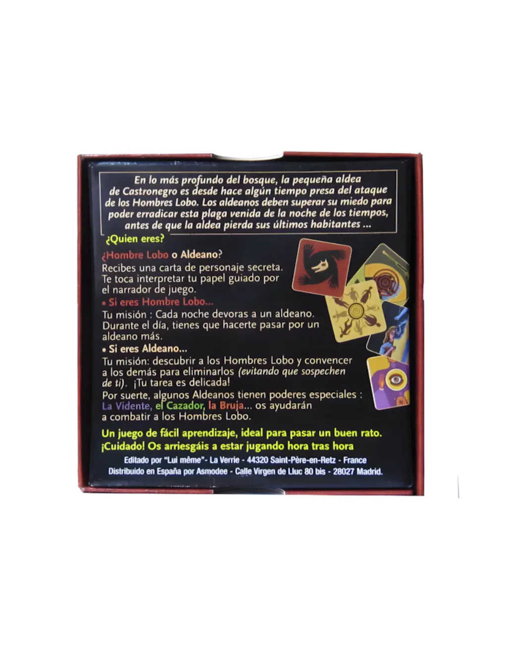 El juego se desarrolla en rondas de noche y día, con un moderador que guía la narración y mantiene el misterio. Los jugadores pueden tener roles especiales, como la vidente, la bruja o el cazador, que añaden giros estratégicos y generan partidas únicas cada vez.