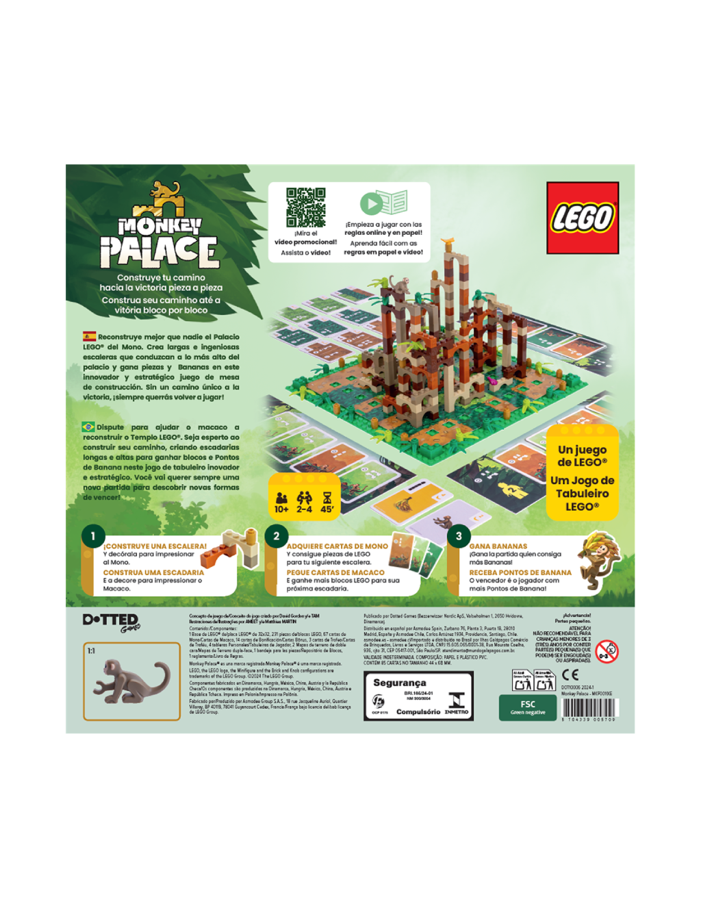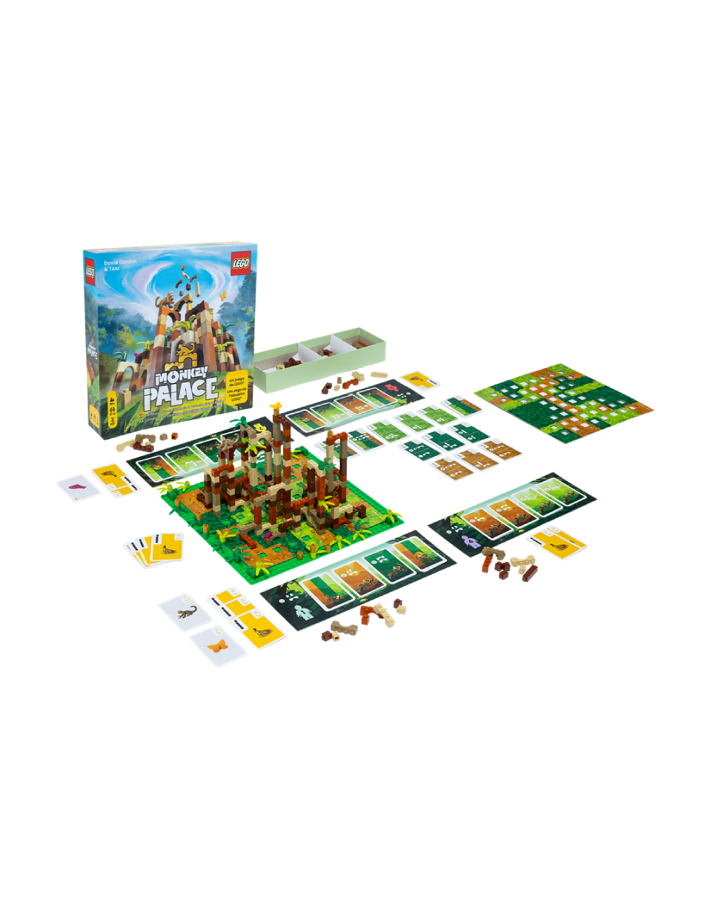 Monkey Palace es un juego de mesa LEGO. En tu turno colocas piezas para construir el palacio y crear caminos. Mueve a tu mono por las nuevas partes del tablero, sube niveles y bloquea a los demás con colocaciones inteligentes. Gana quien llegue más alto y sume más puntos al final. Reglas simples, turnos rápidos y mucha interacción.