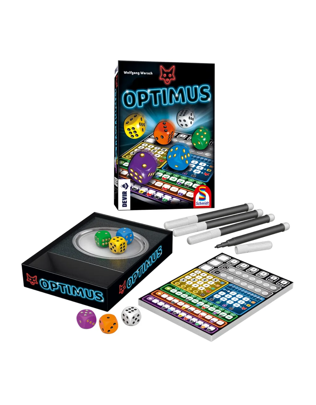 Optimus es un juego de dados donde anotas resultados en tu hoja de puntuación para sumar la mayor cantidad de puntos. En tu turno lanzas, eliges un dado y marcas en el color correspondiente; los dados con valores menores quedan disponibles para el resto. Cada zona de la hoja puntúa de forma distinta y al completar casillas vas activando bonos en cadena que te dan más tiradas, repeticiones o casillas extra. Rápido de explicar, muy rejugable y con ese “una más” clásico de los roll & write.