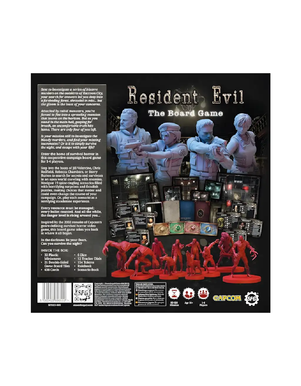 Resident Evil: The Board Game adapta al clásico videojuego original de 1996 en una experiencia de survival horror cooperativo de mesa. Los jugadores asumen los papeles de los icónicos miembros de los S.T.A.R.S., como Jill Valentine, Chris Redfield, Barry Burton o Rebecca Chambers, mientras exploran la mansión Spencer, infestada de zombis, monstruos creados por Umbrella y jefes letales como el Tyrant.