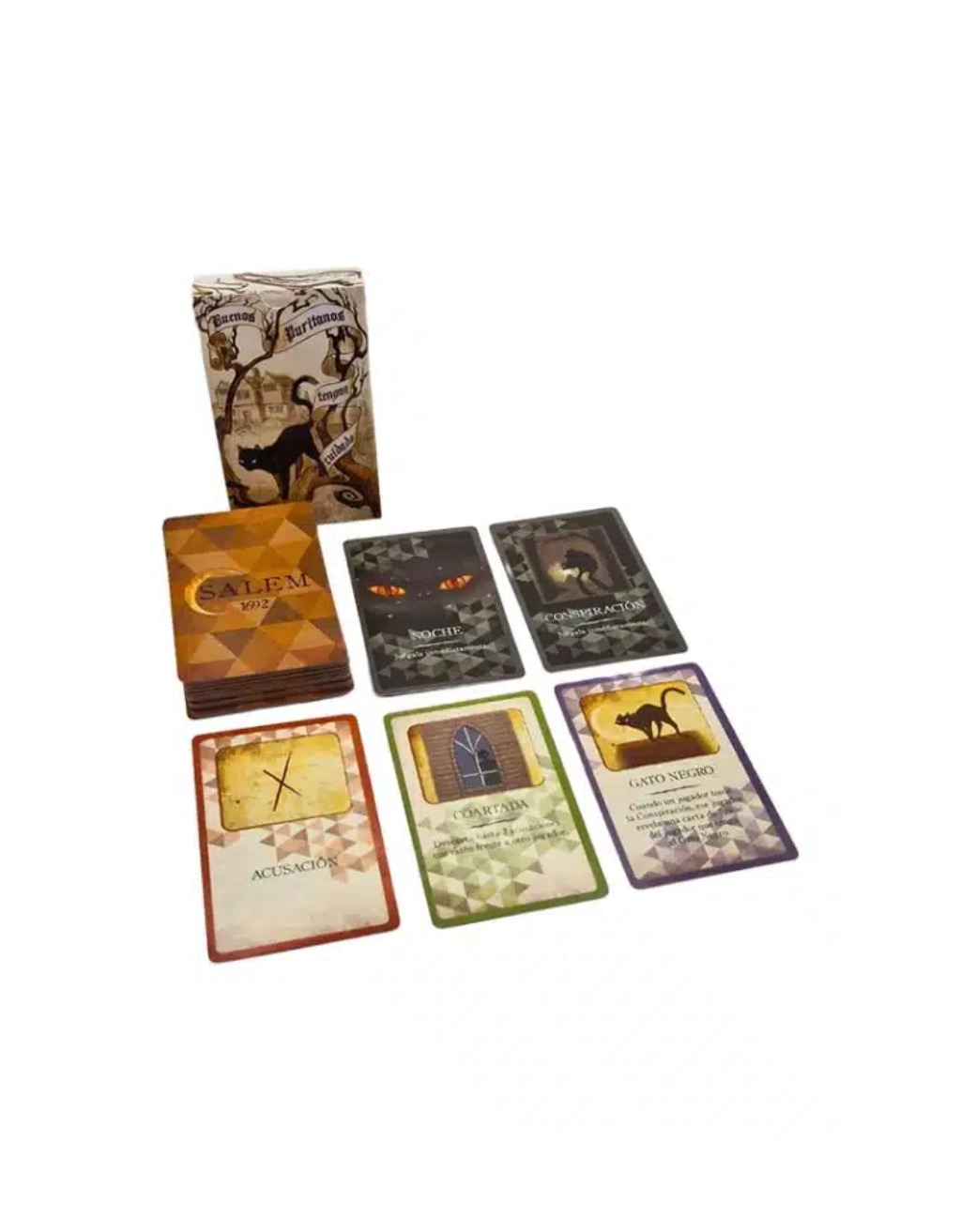 Durante la partida usarás cartas para acusar a otros, defenderte, robar información y forzar a la gente a mostrar sus secretos. A medida que avanza el juego, la paranoia crece: las votaciones, los gritos de “¡bruja!” y las traiciones harán que la mesa se llene de tensión y miradas sospechosas. Si el grupo logra revelar a todas las brujas, el pueblo gana; si las brujas sobreviven el tiempo suficiente, el miedo se apodera de Salem.