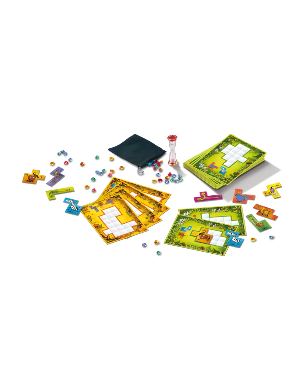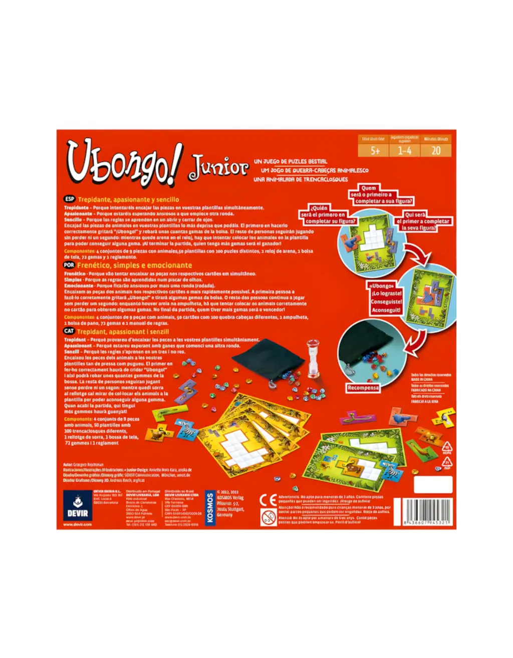 A diferencia de la versión clásica, Ubongo Junior incluye tableros y piezas más sencillas, con ilustraciones llamativas de animales coloridos que ayudan a los niños a familiarizarse con los conceptos de forma, espacio y lógica. El juego estimula la concentración, la resolución de problemas y la percepción visual mientras mantiene un ritmo dinámico.
