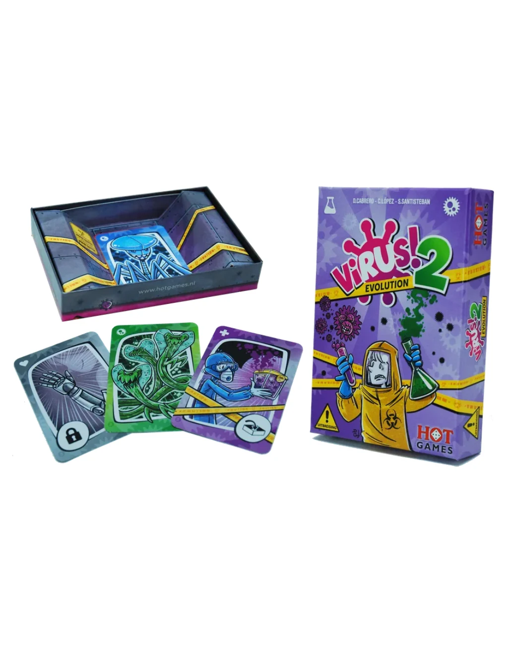 Virus 2: Evolución es la expansión del exitoso juego de cartas Virus!, que añade nuevas cartas, efectos y giros para llevar la diversión y el caos a otro nivel. En esta versión, los virus mutan, los órganos cambian de color y los tratamientos se vuelven más impredecibles, poniendo a prueba incluso a los jugadores más experimentados.
